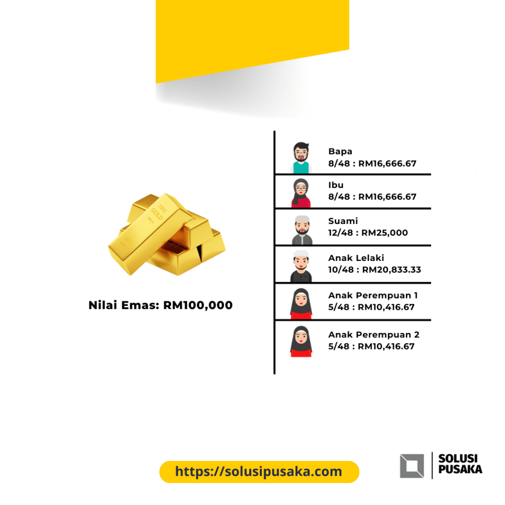 Hak anak perempuan hanya RM3,000 sahaja. Maka dengan cara kedua ini, anak perempuan boleh memiliki emas tersebut dengan memberikan hak anak lelaki RM6,000.