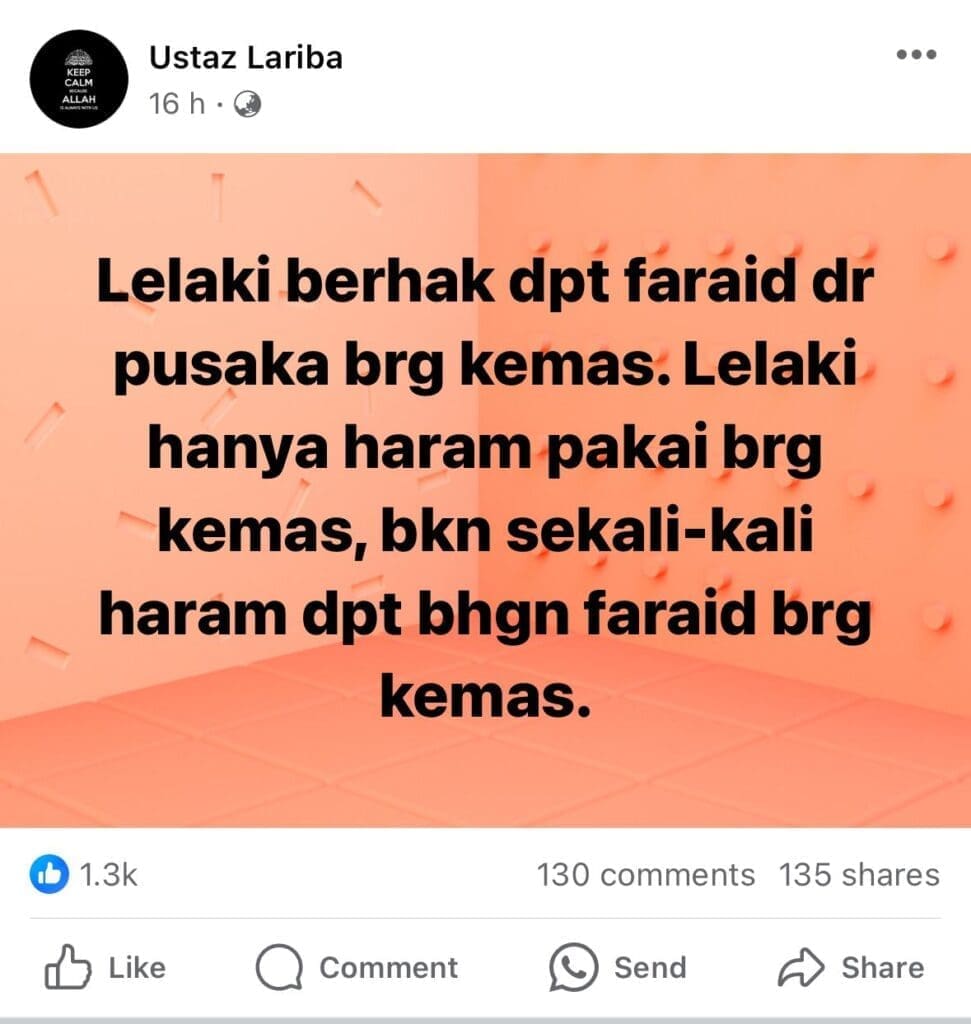 Isu berkaitan emas sering menjadi polemik dalam masyarakat, terutama apabila emas pusaka dianggap sebagai hak eksklusif waris wanita. Ramai yang beranggapan bahawa emas hanya boleh dipakai oleh wanita, tetapi hakikatnya, emas tetap dikategorikan sebagai harta pusaka dan tertakluk kepada hukum faraid. Apa yang diutarakan oleh Ustaz Lariba adalah tepat.